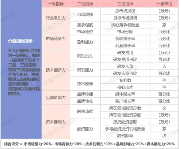 36 氪創(chuàng)投研究院動態(tài)跟蹤觀察了新經濟市場獨角獸企業(yè)們,根據學術界和一級市場參與者們對獨角獸企業(yè)的成長機制及估值研究,結合問卷調研、桌面研究、數據整理等方式,回溯了每一家獨角獸企業(yè)自其成立以來的表現,并建立【價值指數模型】為獨角獸們評分。